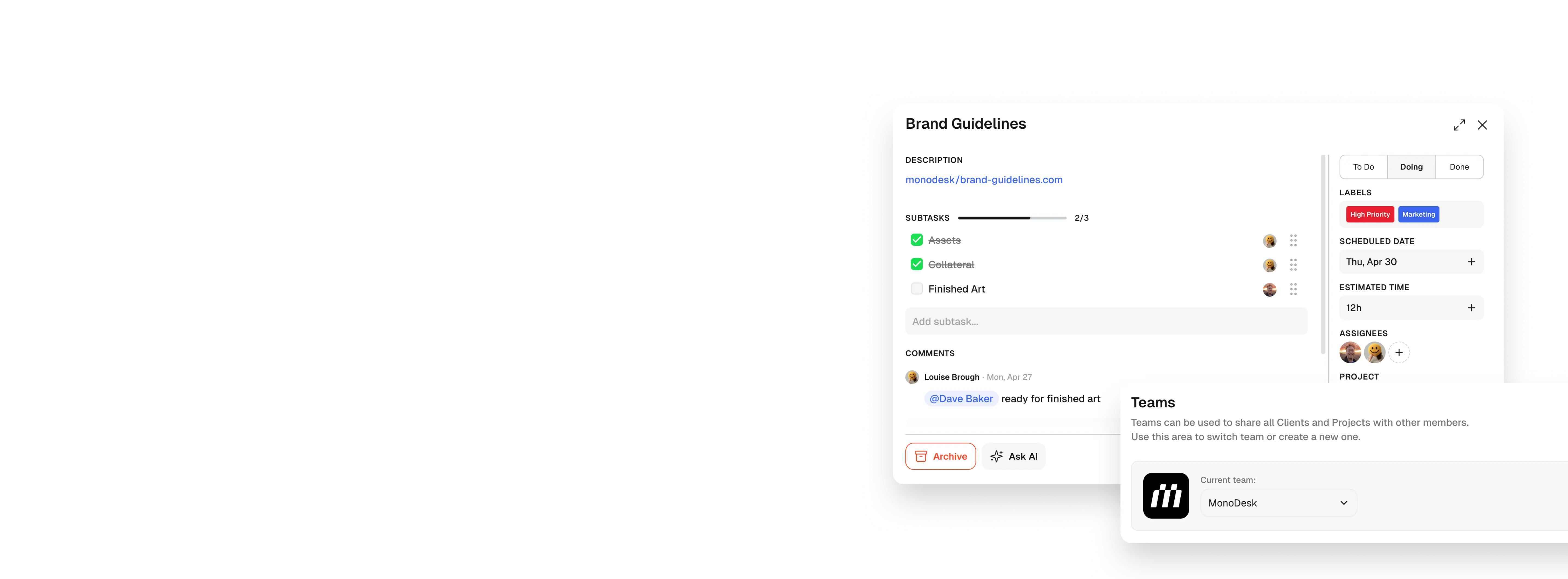 No permission matrices, no role hierarchies, no admin overhead. MonoDesk Teams is designed for the way small creative studios and freelance partnerships actually work. Lightweight, fast, and out of your way.